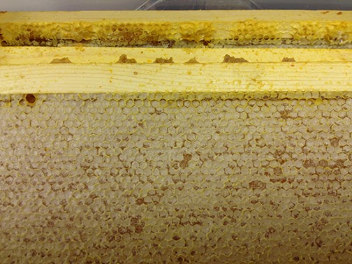 K and Dad decided that extracting is best done on a really hot day in August or September*, when the honey is really runny. Otherwise, it takes a long time to spin the honey out of the frames, and another long time for it to flow down the sides of the extractor and into the honey jars. But, eventually, you do end up with this: